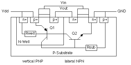A byproduct of the Bulk CMOS structure is a pair of parasitic bipolar
