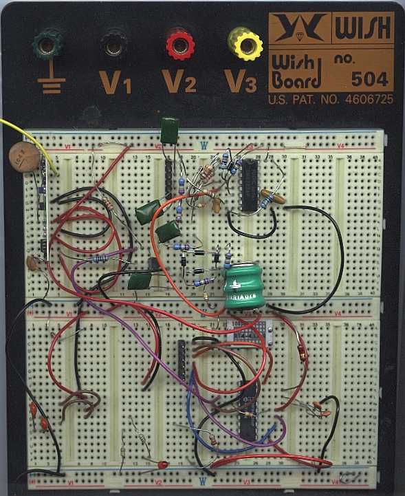 | Simple Ideas should be breadboarded first - here a PIC16F84A is grafted onto an NPC 8223A Caller ID chip from NPC and a 433MHz wireless link. The large empty area on the bottom left is where the BAT can be plugged in to get the system up and running. Get the biggest breadboard you can afford - this one has seen numerous projects developed over the last 3 years. | |||||||||||||||||||||||||||||||||||||||||||||||||||||||||||||||||||||