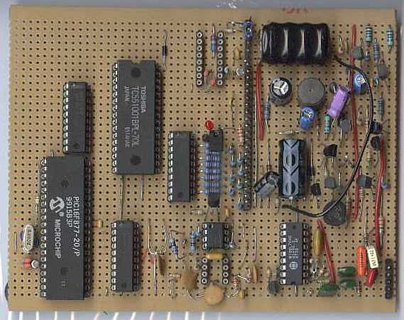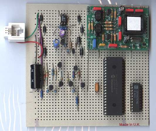 | Here is a RAT3 prototype showing the telephone line interface (left), PIC16F877 microcontroller and commercially available 2400 baud power line modem fitted as a daughter card in the applications area. The 74HCT574 D type latch provides another 8 bit parallel output port to allow an 8 bit R-2R ladder network to be driven from Port D as wells a scanning a keyboard and controlling an alphanumeric LCD. | |||||||||||||||||||||||||||||||||||||||||||||||||||||||||||||||||||||